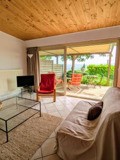 Gîte Maison de 55 m², 2 pièce(s) Vue sur jardin montagne vallée Salon - Séjour/cuisine - Mezzanine - 1 Salle de bains - 1 WC. 1 Chambre - 1 lit de 2 personnes - 2 lits de 1 personne - 1 canapé