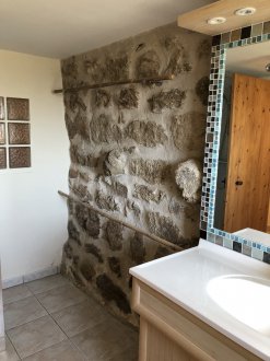 Du bois pour le plafond, pierres et chaux pour les murs, une partie cuisine, une salle à manger et un salon modulables, salle de bain et wc à l'étage inférieur.