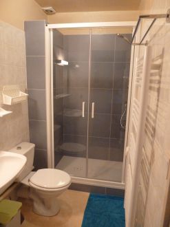 A l'étage : 3 chambres avec 2 lits de 140 x 190 + 2 lits superposés de 90 x 190. Une salle de bain comprenant lavabo + WC + douche + sèche-serviettes électrique.