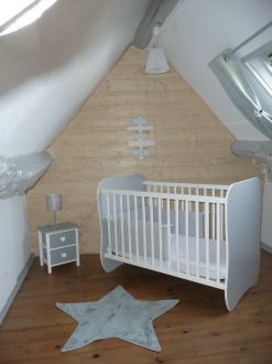 A l'étage, une belle chambre sous les combles avec un lit en 140, une chambre bébé avec un lit en bois et un parc avec tapis d'éveil, un WC indépendant avec lavabo.