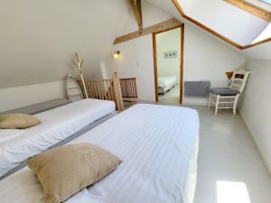 Logement pour 4 personnes :Gîte de 55 m², 3 pièce(s)Vue sur jardin Salon - Séjour/cuisine - Mezzanine - 1 Salle de bains - 1 WC. 2 Chambres - 1 lit de 2 personnes - 2 lits de 1 personne