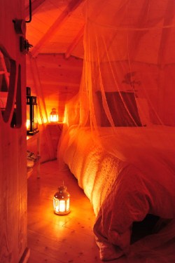 Tarif à la nuitée : 139 - 169€ Cabane Couple 2-3 couchages : 1 lit double et 1 fauteuil convertible 1 place |
