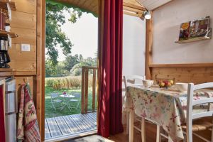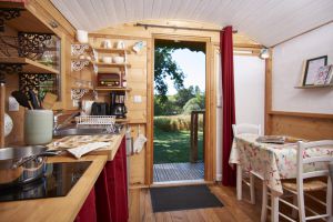 Logement pour 2 personnes :Roulotte de 18 m², 1 pièce(s)Vue sur campagne Salon - Cuisine - Séjour/cuisine - 1 Salle de bains - 1 WC. 1 Salle de bains/WC. - 1 lit de 2 personnes - 1 lit de 1 personne