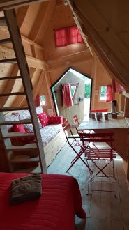Tarif à la nuitée : 125 - 179€ La Casa Bella peut accueillir jusqu'à 4 personnes : un lit de 140 en mezzanine et un canapé tiroir transformable en lit de 2 x 80 . Une bouilloire et table escamotable à l'intérieur. |
