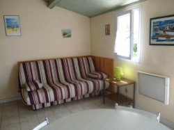 canapé lit confort, cuisine équipée 2 feux gaz, four, micro-ondes, réfrigérateur avec compartiment congélateur.
