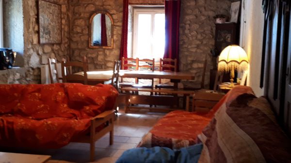 Entrée côté sud, intérieur bois et pierres. Salon (3 canapés dont 1 canapé-lit) salle-à-manger avec table monastère, grande cuisine conviviale avec poêle, 1 grande chambre avec 5 lits simples et 2 lits superposés, 1 chambre avec lit double, 1 sdb. Salon de jardin en été.